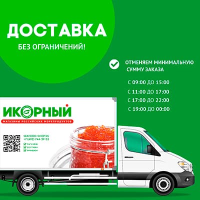 Срочно понадобилась баночка печени трески или захотелось немного устриц? Не проблема! Мы отменяем ограничения и доставляем заказы любой стоимости! Доставка заказов до 2000₽ - 199₽, от 2000₽ - бесплатно по Москве (до МКАД +5 км).
