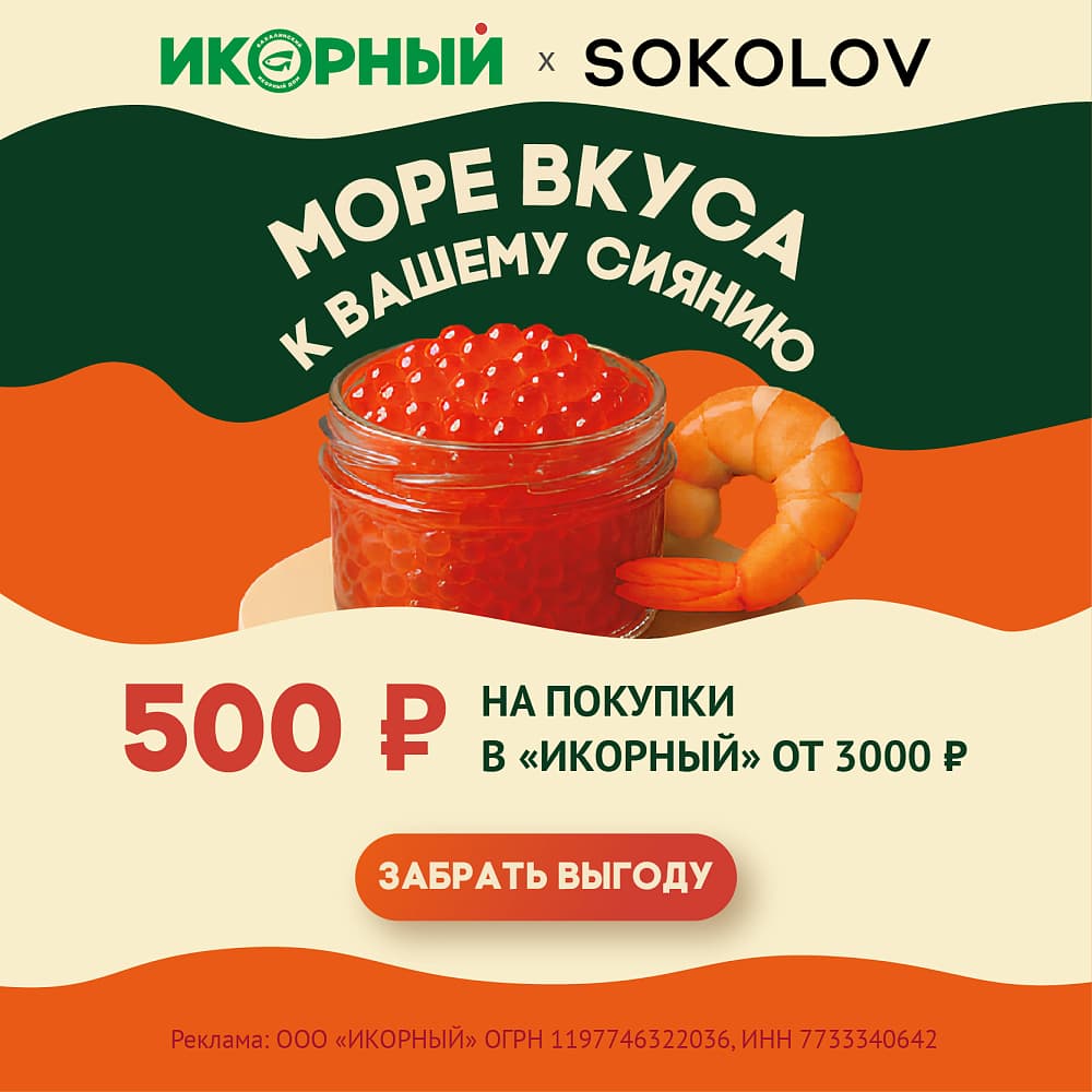 «500 ₽ выгоды на покупки в «Икорном» с промокодами SOKOLOV»