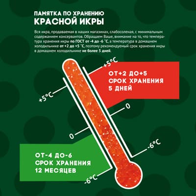 Хочется запастись качественной красной икрой впрок по не выросшим пока ценам? Тогда рекомендуем обратить внимание на наш ассортимент замороженной икры: ее солят и замораживают высокотехнологичным шоковым методом 1 раз на месте лова. Благодаря этому, она прекрасно хранится в самой обычной морозилке. Главный секрет этой икры – медленная разморозка (6 часов) в холодильнике – и тогда вкус и консистенция будут отменными.